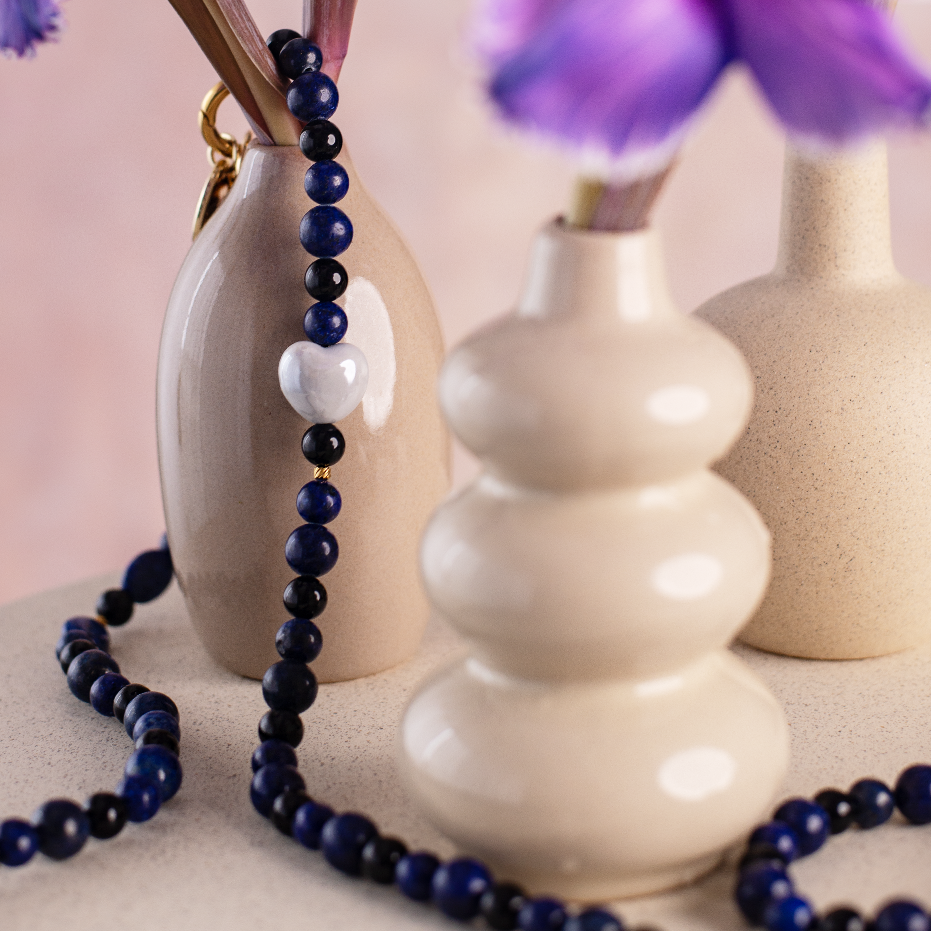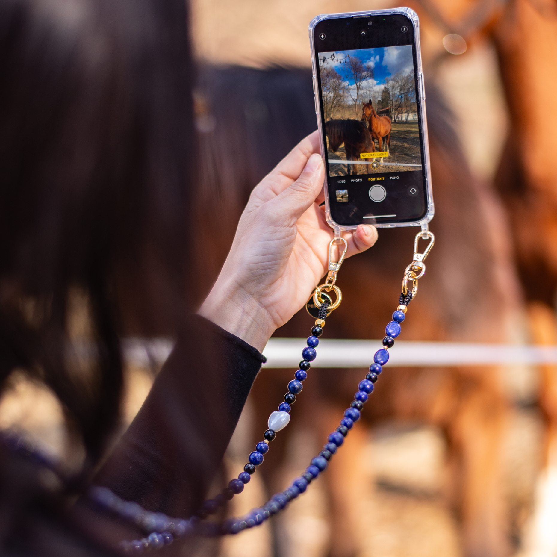 Fiecare element este montat manual, în stilul Desirade, pentru un aspect premium și un mix vizual armonios. Strapul se atașează ușor de husă și îți ține telefonul în siguranță, mereu la îndemână — ideal pentru zile active, plimbări sau momentele în care ai nevoie de libertate de mișcare și un accesoriu care îți completează ținuta.