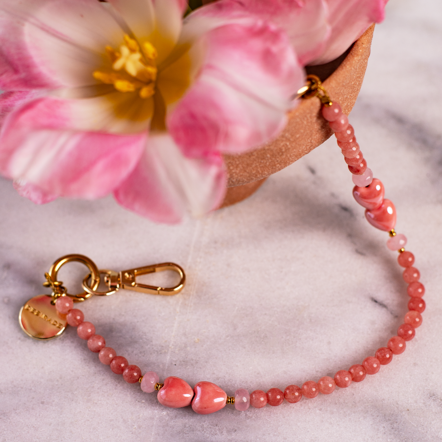 ROSA SOAVE este strapul care aduce o notă delicată și feminină fiecărei apariții, combinând texturi naturale și forme jucăușe într-un accesoriu ce îmbină utilitatea cu estetica. Realizat dintr-un mix armonios de inimioare din ceramică roz și pietre naturale în nuanțe soft, strapul creează un echilibru perfect între romantism, naturalețe și stil modern.