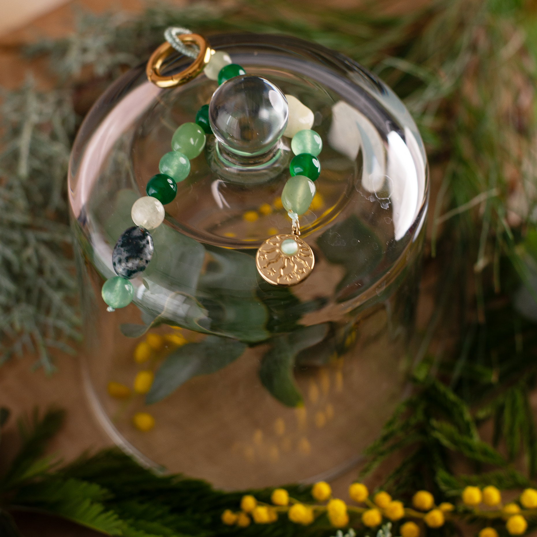 Tonurile variate de verde, completate de accentele aurii, creează un efect vizual natural și sofisticat, ușor de integrat atât în ținute casual, cât și în combinații mai elegante. Medalionul cu detaliu solar adaugă un element simbolic și o notă luminoasă designului, transformând charmul într-un accesoriu cu personalitate.